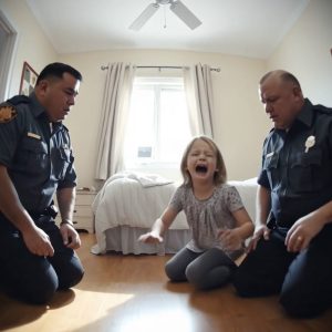 The house was quiet, the only sound the rhythmic ticking of the hallway clock. Officer Daniels, a seasoned detective, knelt to Mia’s level, studying her wide, sincere…
