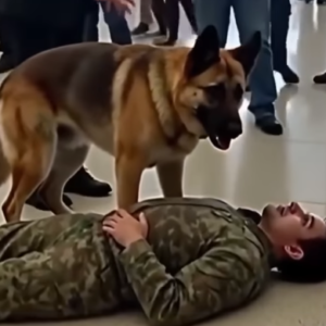 German Shepherd guards soldier lying on airport floor