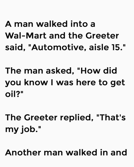 A man walked into a Wal-Mart and the greeter said, “Automotive, aisle 15.”