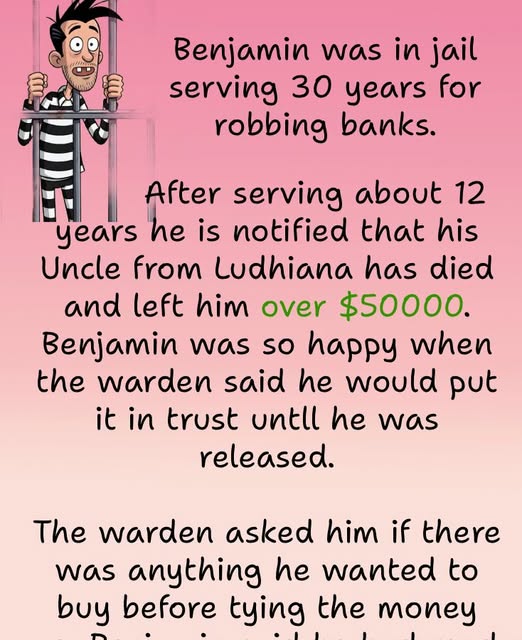 After serving about 12 years he is notified that his Uncle from Ludhiana has died and left him over $50000. Benjamin was so happy when the warden said he would put it in trust untll he was released.