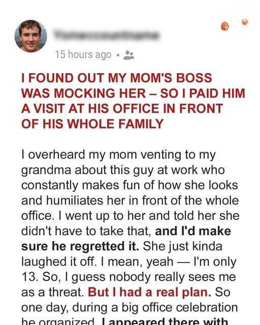 When she was invited to his company’s awards dinner, I decided enough was enough. With help from his daughter, I played audio recordings of his cruel remarks through the speakers — right in the middle of his acceptance speech.The room went silent. My mom was shocked. Her boss?