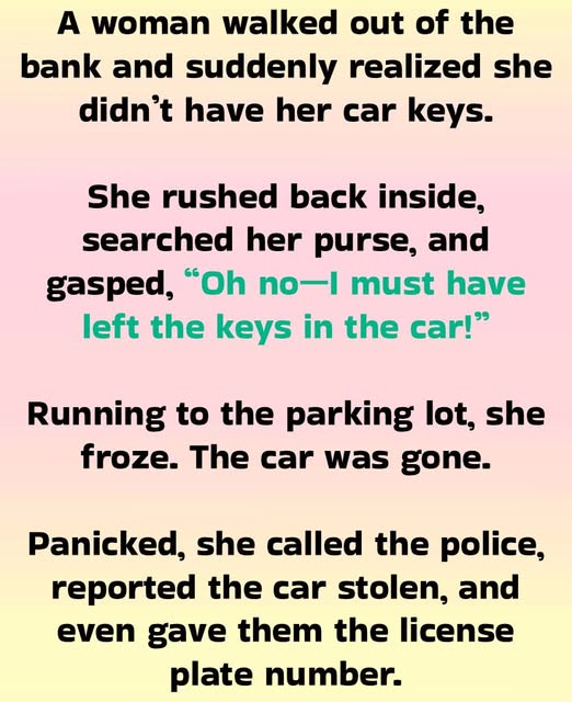 She rushed back inside, searched her purse, and gasped, “Oh no—I must have left the keys in the car!”
