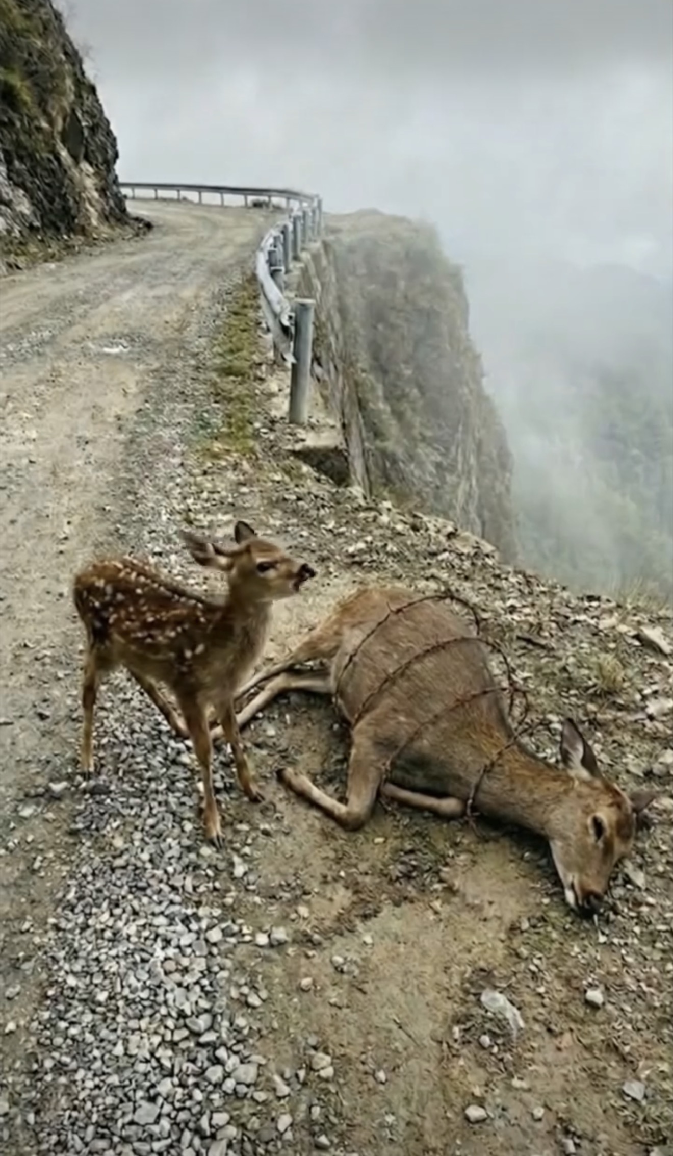This powerful image captures a tragic and emotional scene on a remote mountain road, where a