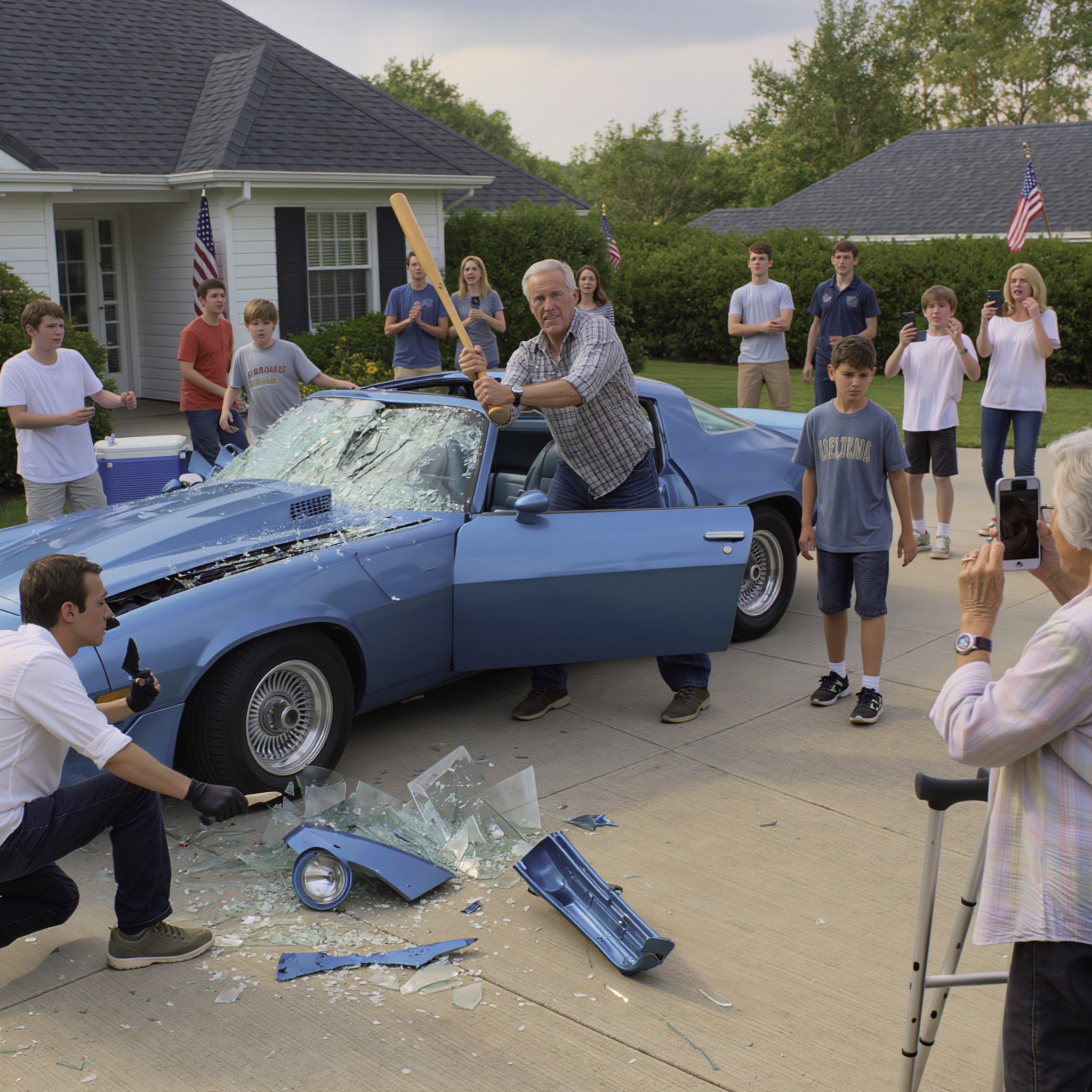 Dad struck again, smashing the headlights. Shattered glass scattered across the driveway like confetti from a nightmare. Tyler stood frozen, tears streaming down his face, his crying turning raw and desperate.