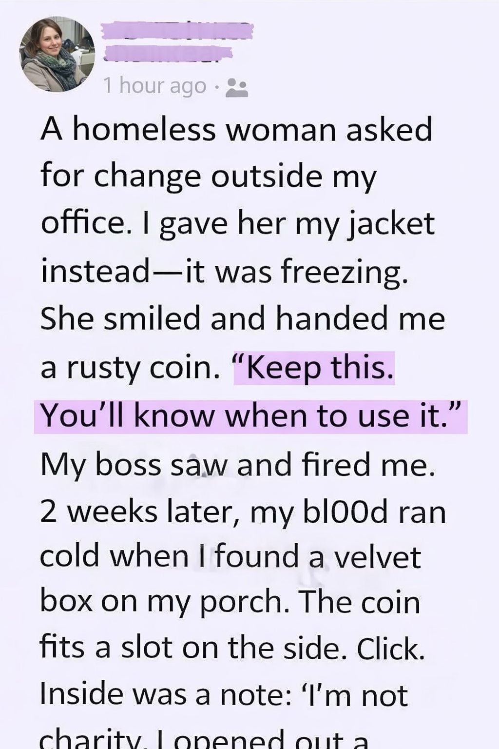 Two difficult weeks followed—applications, rejections, and dwindling savings. Then one morning, a velvet box appeared at my door. Inside was a slot shaped exactly like the coin. Heart pounding, I inserted it. Click. The lid opened to reveal a note: I’m not homeless. I’m a CEO. I test people. Inside was also a job offer—six figures, starting Monday.