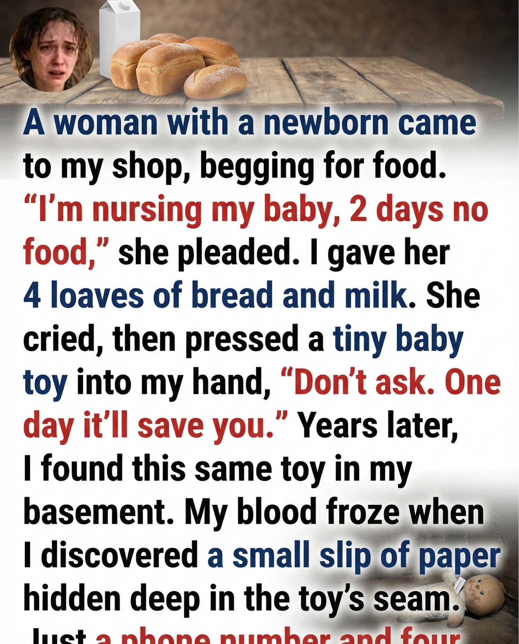 I didn’t question her. I didn’t ask for explanations or proof. I turned to the shelves, gathered four loaves of bread and a carton of milk, and placed the bag gently into her hands.
