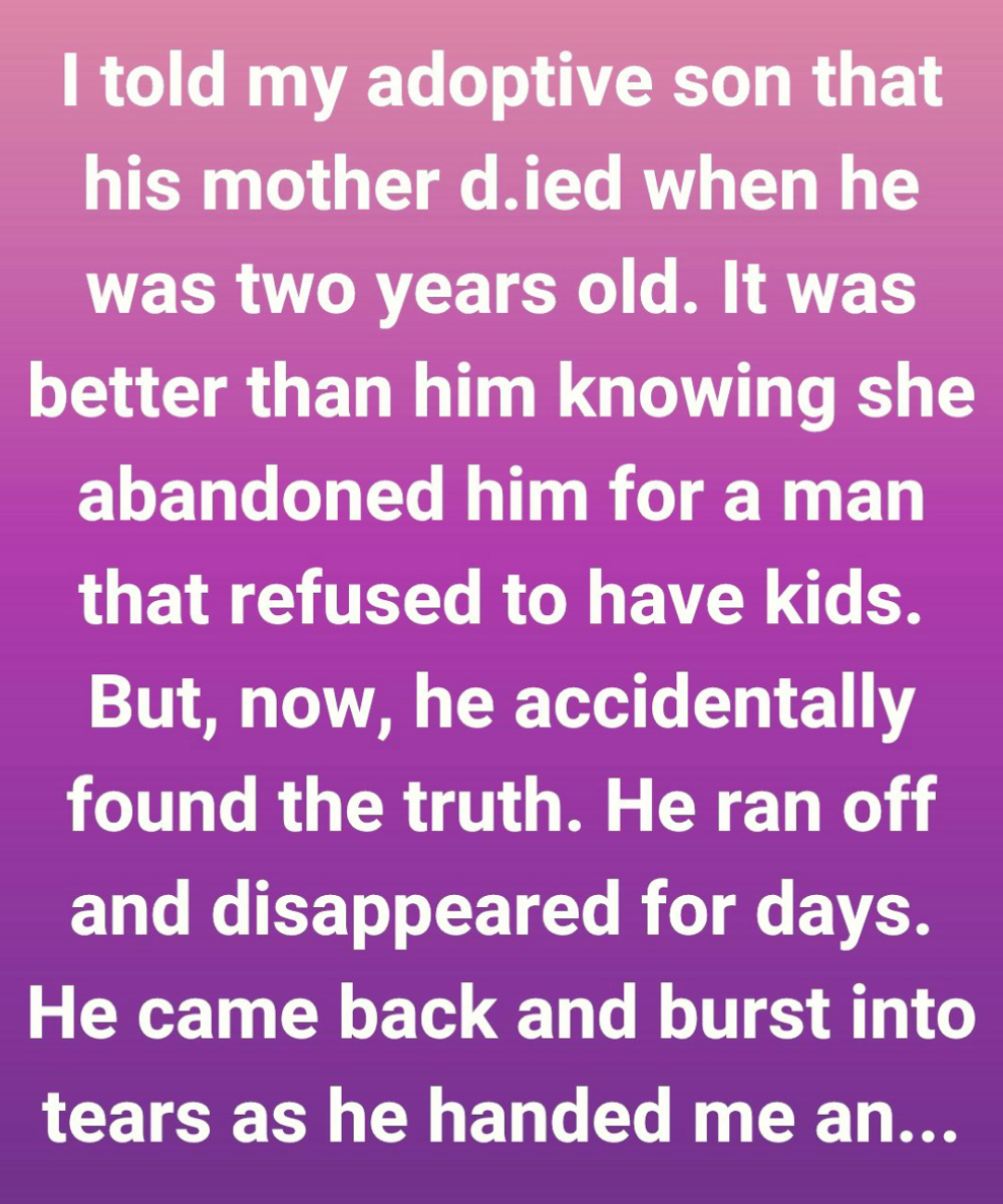 “You lied to me,” he said, his voice breaking. “You told me she died when I was two.”