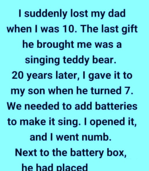 When I was 10 years old, I suddenly lost my dad. The last gift he gave me was a singing teddy bear, which I cherished. Twenty years later, when my son turned seven, I decided to pass the bear on to him. To make it sing again, we needed to replace the batteries. When I opened the compartment, I froze in shock—inside, tucked next to the battery box, was a small cassette.