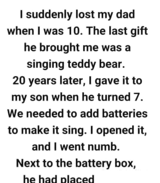 When I was 10 years old, I suddenly lost my dad. The last gift he gave me was a singing teddy bear, which I cherished. Twenty years later, when my son turned seven, I decided to pass the bear on to him. To make it sing again, we needed to replace the batteries. When I opened the compartment, I froze in shock—inside, tucked next to the battery box, was a small cassette.