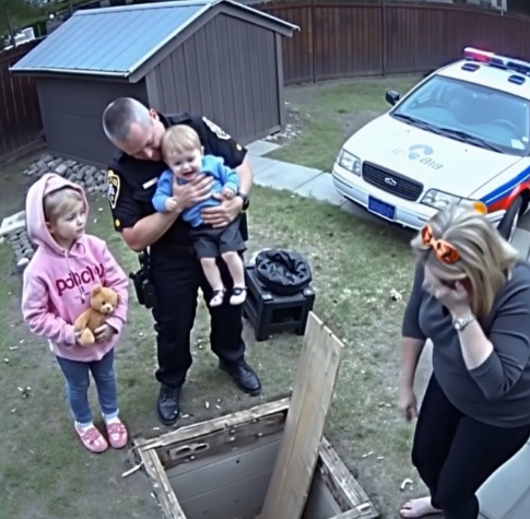 The shed was cluttered with gardening tools and old furniture, the floor covered with a thick layer of dust. My heart pounded in my chest as an officer began to pull back a loose wooden plank, revealing a small, hidden compartment beneath. And there, nestled among the shadows, was my son Noah.