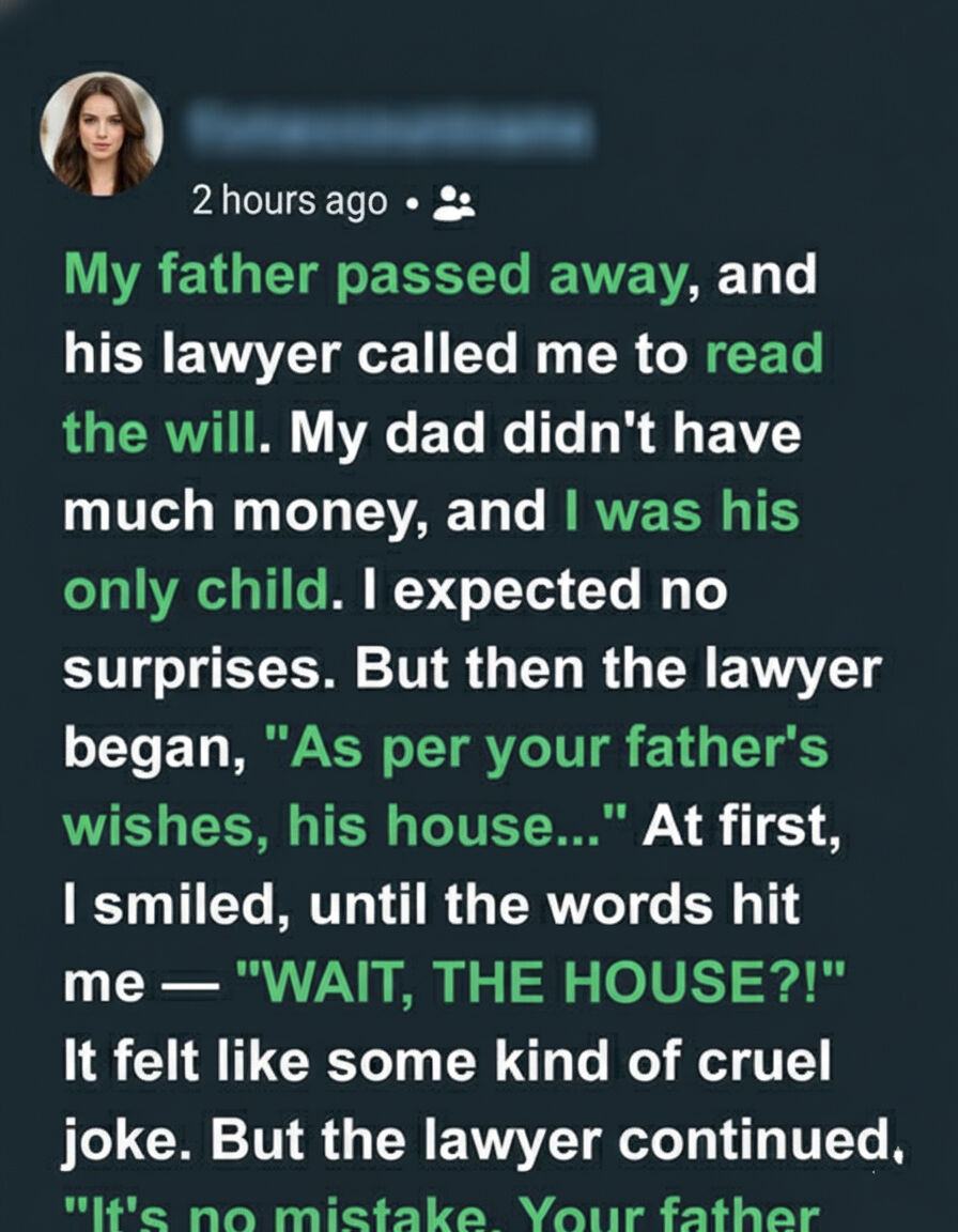 My father had been my anchor for as long as I could remember. After my mother d.i.3.d when I was very young, he became everything. Provider, protector, confidant. Or at least, that was how it had always seemed. In the last few years of his life, though, the cracks began to show. Medical bills piled up. Old debts resurfaced. The small house we shared, the one filled with memories of quiet dinners and late-night conversations, was slipping through our fingers. By the time he passed, foreclosure notices were already taped to the door.