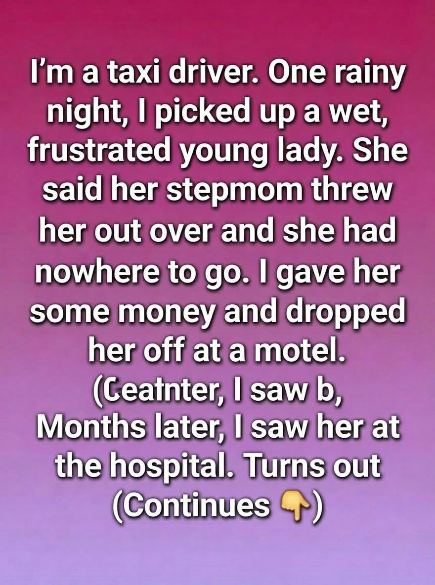 I’m a taxi driver, and one rainy night I picked up a young woman who was soaked, upset, and out of options. She told me her stepmother had thrown her out over rent, and she had nowhere to go. Hearing that, I couldn’t just drop her on a corner. I gave her a little money to help with a motel and made sure she got there safely.