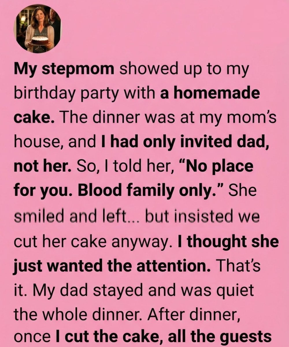 My stepmother arrived at my birthday dinner carrying a homemade cake I hadn’t asked for. The celebration was at my mom’s house, and I had invited only my dad. The history between the adults in my life was complicated enough without adding more tension, and I’d planned the evening carefully to avoid awkwardness. So when the doorbell rang and she stood there with a cake balanced in her hands and uncertainty in her eyes, I reacted from old instincts. “This isn’t really the right place for you,” I said, keeping my voice polite but firm. “Tonight is just for immediate family.” She didn’t argue. She set the cake gently on the dining table, wished me a happy birthday, and turned to leave. “Maybe you can still share it later,” she added softly. I assumed it was a bid to stay included and brushed it off.