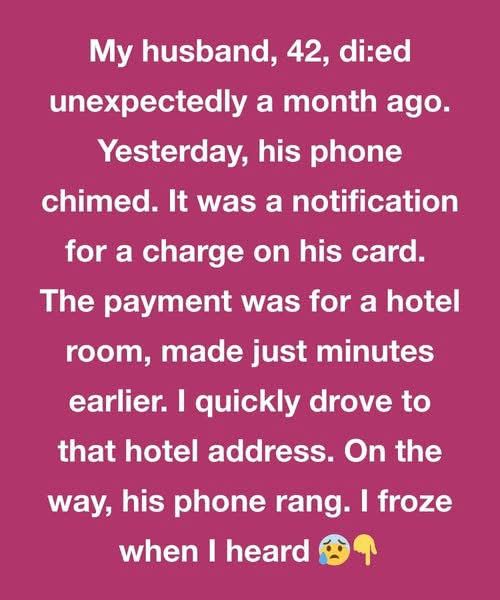 A month after my 42-year-old husband supposedly died, his phone chimed with a hotel charge made just minutes earlier. My hands shook as I drove to the address, my mind scrambling to make sense of how a dead man’s card could still be booking rooms. When I reached the hotel and asked for his room number, the receptionist calmly sent me to 403. I knocked, heart pounding, but no one answered. As I slid down the hallway wall trying to steady myself, a teenage housekeeper stepped out of the neighboring room and asked softly, “Are you here for him too?” She insisted she had seen my husband leave earlier—and that he didn’t look dead.
