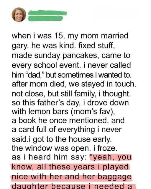 I drove six hours on Father’s Day with a tray of my mother’s lemon bars, a carefully chosen World War II biography, and a handwritten card that had taken me ten years to find the courage to write. I thought I was closing a chapter—thanking the man who had stepped in when my biological father disappeared before I could remember him. Gary had been steady where others were fleeting: fixing squeaky hinges without being asked, clapping at my school plays like they were Broadway debuts, flipping pancakes every Sunday without fail. I never called him “Dad,” but I believed he had earned something close to it. After my mother died, we didn’t grow closer, yet I thought what remained between us was real.