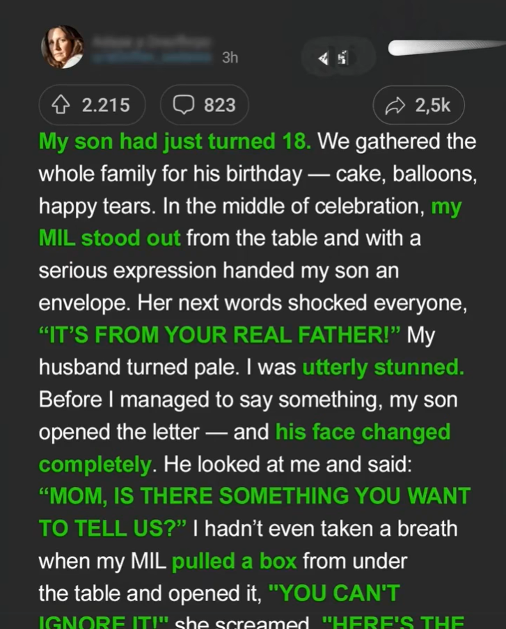 The people we trust most can hurt us the deepest. For me, it was my mother-in-law, Doris. On my son Sam’s 18th birthday—the night meant to be full of joy—she handed him a letter and a box, shattering everything we thought we knew. We had planned a perfect celebration. The backyard was glowing with string lights, the smell of Adam’s famous ribs lingered, and Sam’s favorite triple-layer chocolate cake was half-eaten. Laughter filled the air as family shared stories about Sam’s childhood.