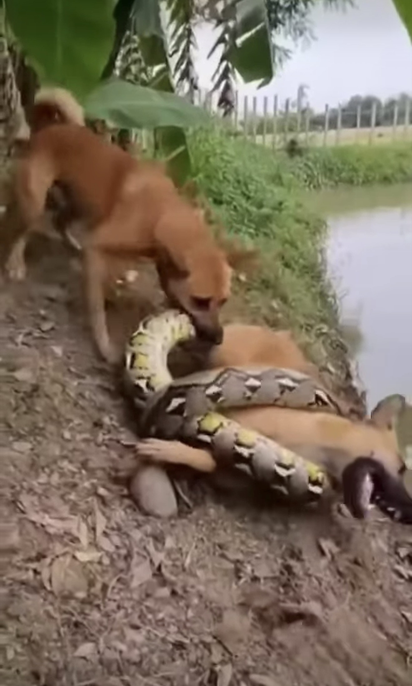 A frightening incident was captured near a riverbank, where a dog was attacked by a large snake.