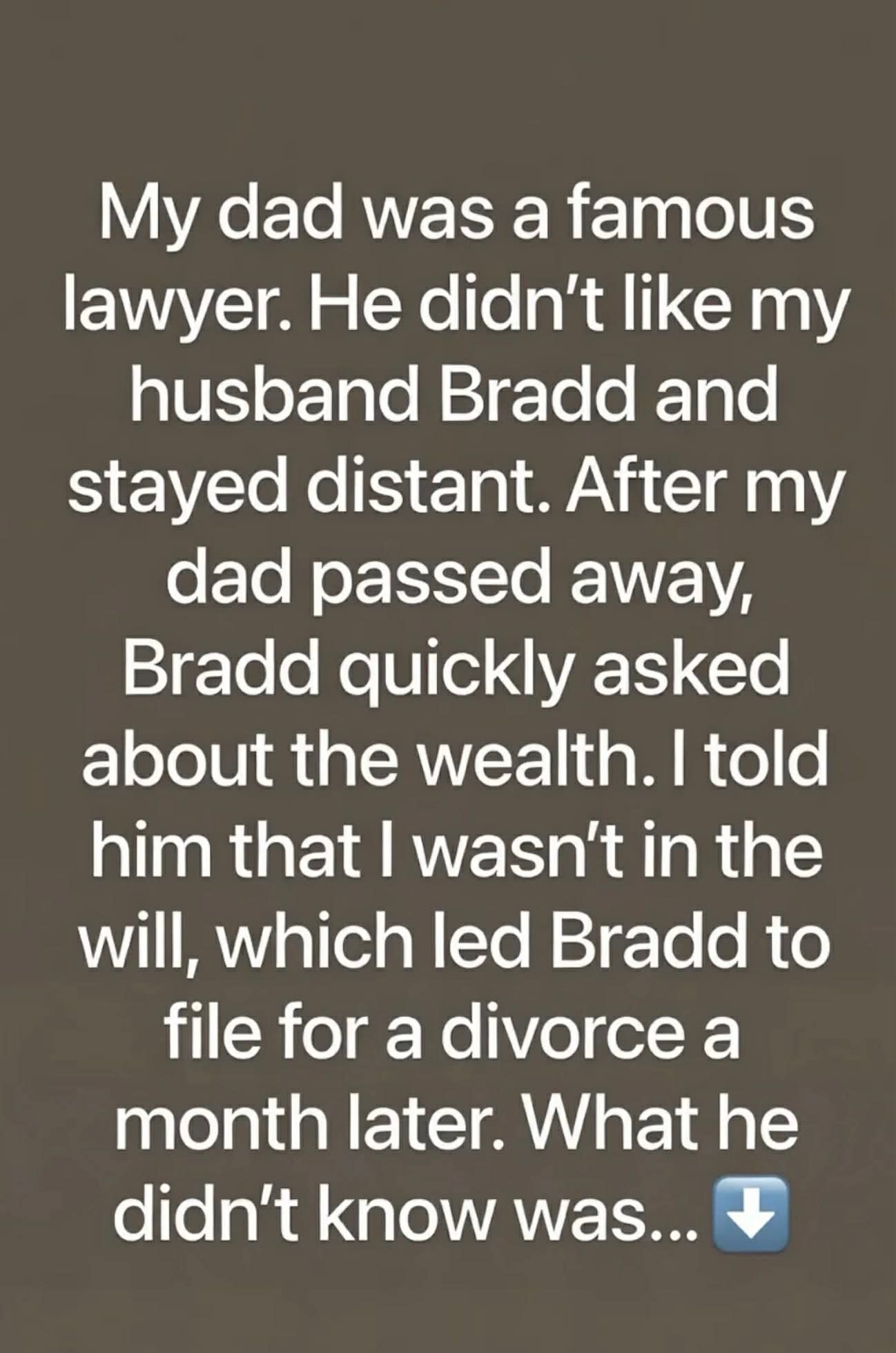 But there was more. A week later, Sarah’s father’s lawyer called her in. Her father had left a private addendum to his will: If Bradd remained married to Sarah for five years after his death, he would receive half the inheritance. If they divorced before then, Sarah would inherit it all. Within days, Bradd was gone. No goodbye, no fight—just a trail of silence. He had chosen money over love, but in doing so, lost both. Sarah grieved the marriage, but also felt relief. Guided by her father’s wisdom, she built her own career, invested wisely, and created a life defined by her own achievements. She carried his values with her, knowing he had given her the greatest inheritance of all—the strength to stand on her own. Her father had been right about Bradd. And in the end, Sarah learned that love without loyalty is nothing… but loyalty to yourself can make you unstoppable.
