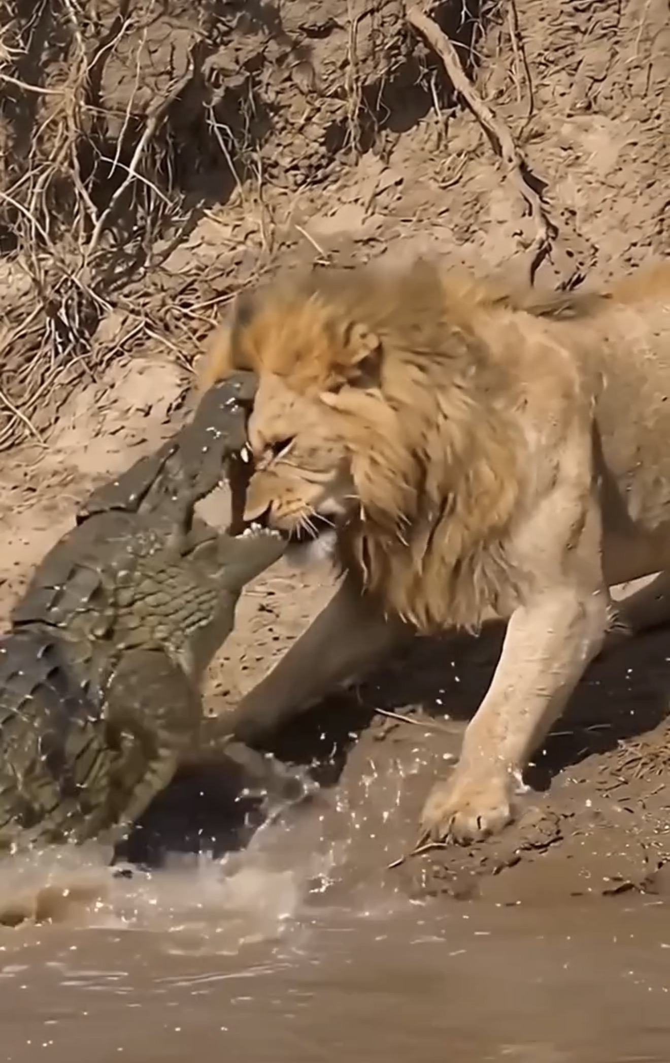 A dramatic wildlife encounter unfolded at the edge of a muddy riverbank as a powerful lion clashed with a massive crocodile in a fight for survival. The intense moment, captured on camera, shows the king of the savannah facing one of the river’s most dangerous predators in a rare and breathtaking confrontation.