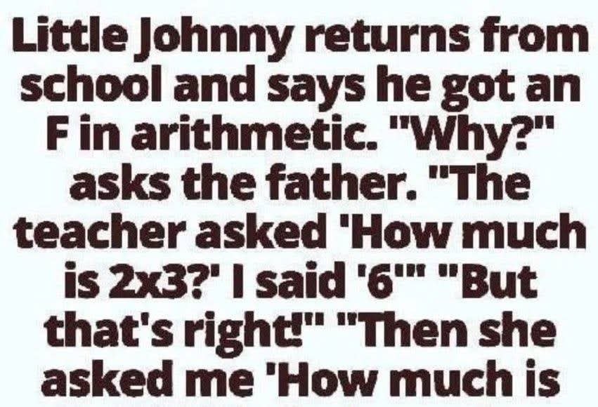 A little boy comes home from school and tells his father,”I got an F in math today.”His father replies, ”What happened?”The boy says, ”Well, my teacher asked me, ‘What’s 3 times 2’, and I said 6.’”