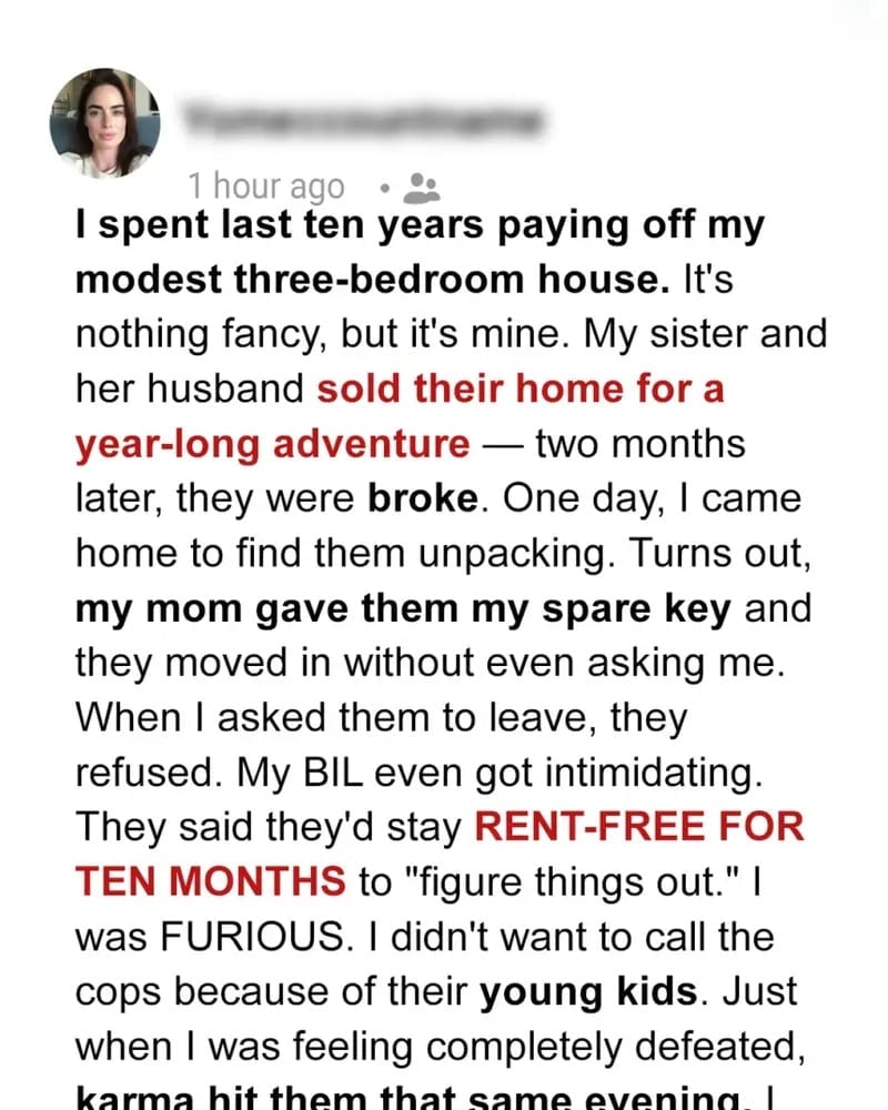 Later, over coffee, Alex reminded her she’d done the right thing. And as she looked around her now-peaceful living room, Phoebe realized some lessons are priceless: never give out spare keys lightly — and karma, when it comes fast, is the sweetest eviction notice of all.READ MORE BELOW