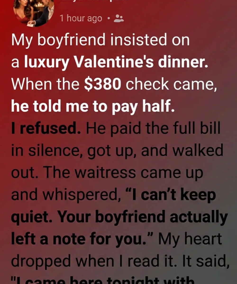 Valentine’s Day had always felt meaningful to me, and this year seemed especially perfect. My boyfriend surprised me with a reservation at one of the most elegant restaurants in the city—soft violin music, candlelight reflecting off crystal glasses, and crisp white tablecloths that made the evening feel almost cinematic. We laughed, shared stories, and leaned closer across the table like couples in romantic films. For a few hours, everything felt effortless and beautiful, and I remember thinking how thoughtful he was for planning such a special night for us.