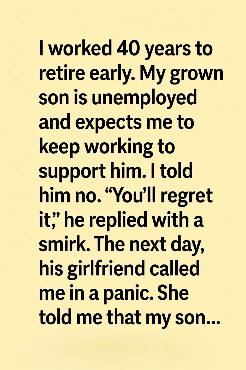 My grown son, however, had different expectations. He had been struggling to find stable work, and instead of seeking new opportunities, he began to rely on me financially. One evening, he said, “You’ll need to keep working so you can help me out.” I took a deep breath and gently told him, “I love you, but I’ve worked my whole life for this moment. I can’t keep working just to support you. It’s time for you to take responsibility.”