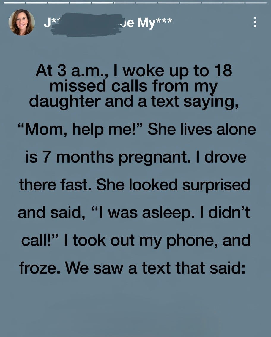 A mother woke up at 3 a.m. to 18 missed calls from her pregnant daughter and a message saying, “Mom, help me!” Panicked, she drove to her daughter’s apartment, only to find her asleep and confused—she hadn’t made any calls. Then they noticed another strange text on the phone: “Come to the park. Now. Please.” With no name attached and no record of the calls on the daughter’s phone, the mother decided to drive by the nearby park to see what was going on.