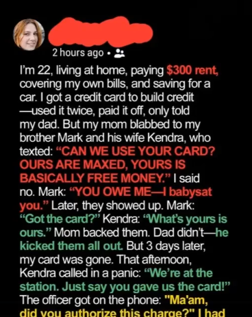 Then came the call: Mark and Kendra had been arrested trying to use the card again. The store flagged it, police were called, and they got booked. The officer asked if I’d given them permission. I said: “No. That card was stolen.” They screamed betrayal. But to me, the real betrayal was thinking they could steal my future and call it “family.”I didn’t press charges, but they still faced embarrassment, paperwork, and a fraud mark. Mom came home later, quieter. No apologies, but she made my favorite meals. Mark and Kendra? Haven’t asked me for anything since.