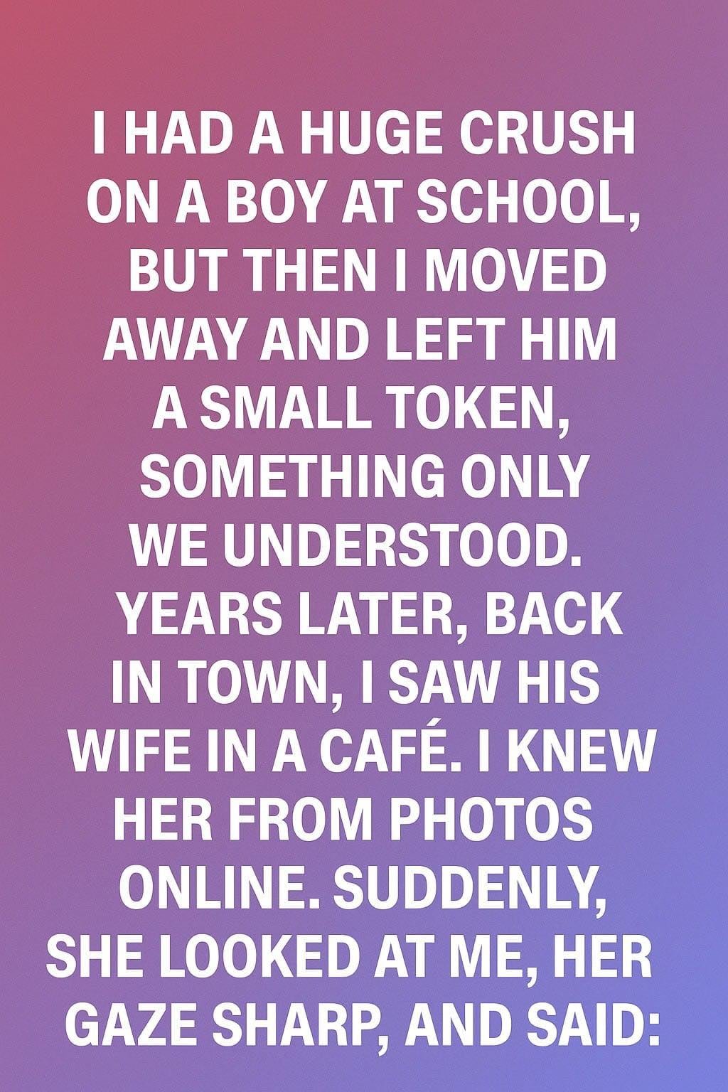 I had a huge crush on a boy at school, and the night before my family moved away, I left him a small token—a simple braided bracelet we’d made together during art class. It was our secret, my silent way of saying goodbye without words. Years later, back in town, I spotted his wife in a café. Something about her gaze was sharp, knowing. “You’re the one who left him that bracelet, aren’t you?” she asked. My heart stopped.
