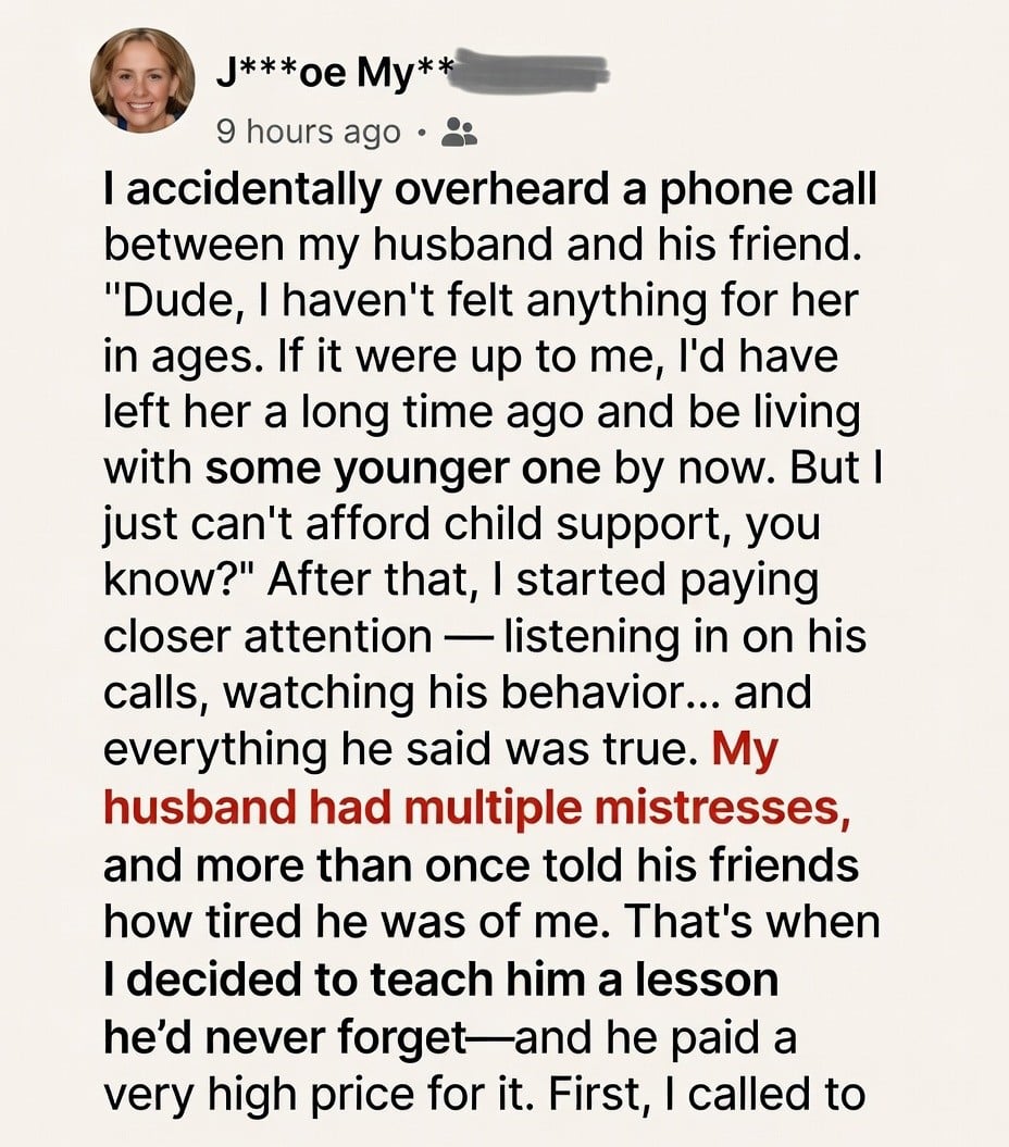 After fifteen years of marriage, a woman believed she had a stable life with her husband and their two children. One evening, while heading downstairs to prepare dinner, she overheard her husband on the phone admitting he was only staying in the marriage to avoid paying child support if they divorced. Hearing him reduce their relationship to a financial calculation shattered her trust. Instead of confronting him immediately, she quietly finished the evening, but inside she knew everything had changed.