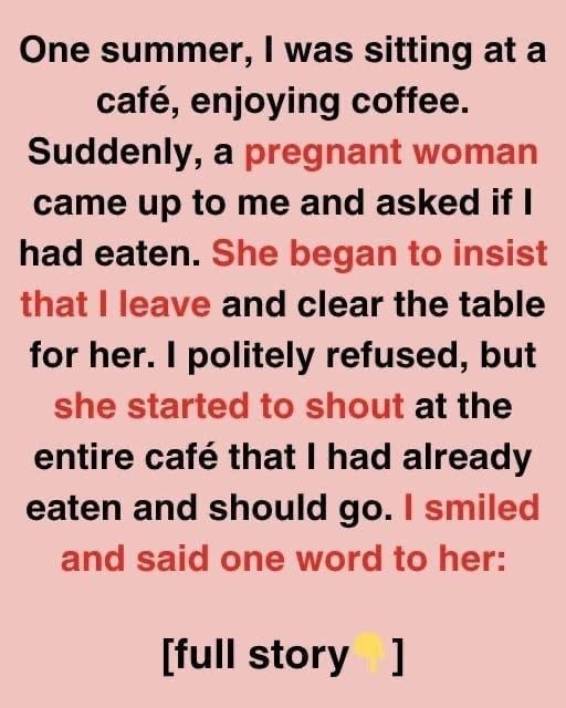 One summer evening, I was relaxing at a local café, sipping on a cup of coffee after a satisfying dinner. The atmosphere was calm, the kind of place where you could unwind and enjoy a moment of peace. However, my tranquility was suddenly interrupted when a pregnant woman approached my table. Without any greeting, she bluntly asked if I had already eaten and, in a rather rude tone, demanded that I leave the table immediately to make space for her.