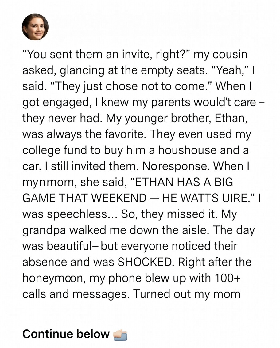 When my mom finally called, her anger was not about missing the wedding — it was about her reputation. She claimed Ethan “needed them,” proving once again that I was never her priority. I realized then that their absence had revealed a truth I had long avoided: they had never truly seen me. Yet as days passed, the judgment of the community and the support from others began to shift my perspective. Even Ethan reached out, claiming he didn’t know they skipped my wedding. Whether that was true or not no longer mattered.