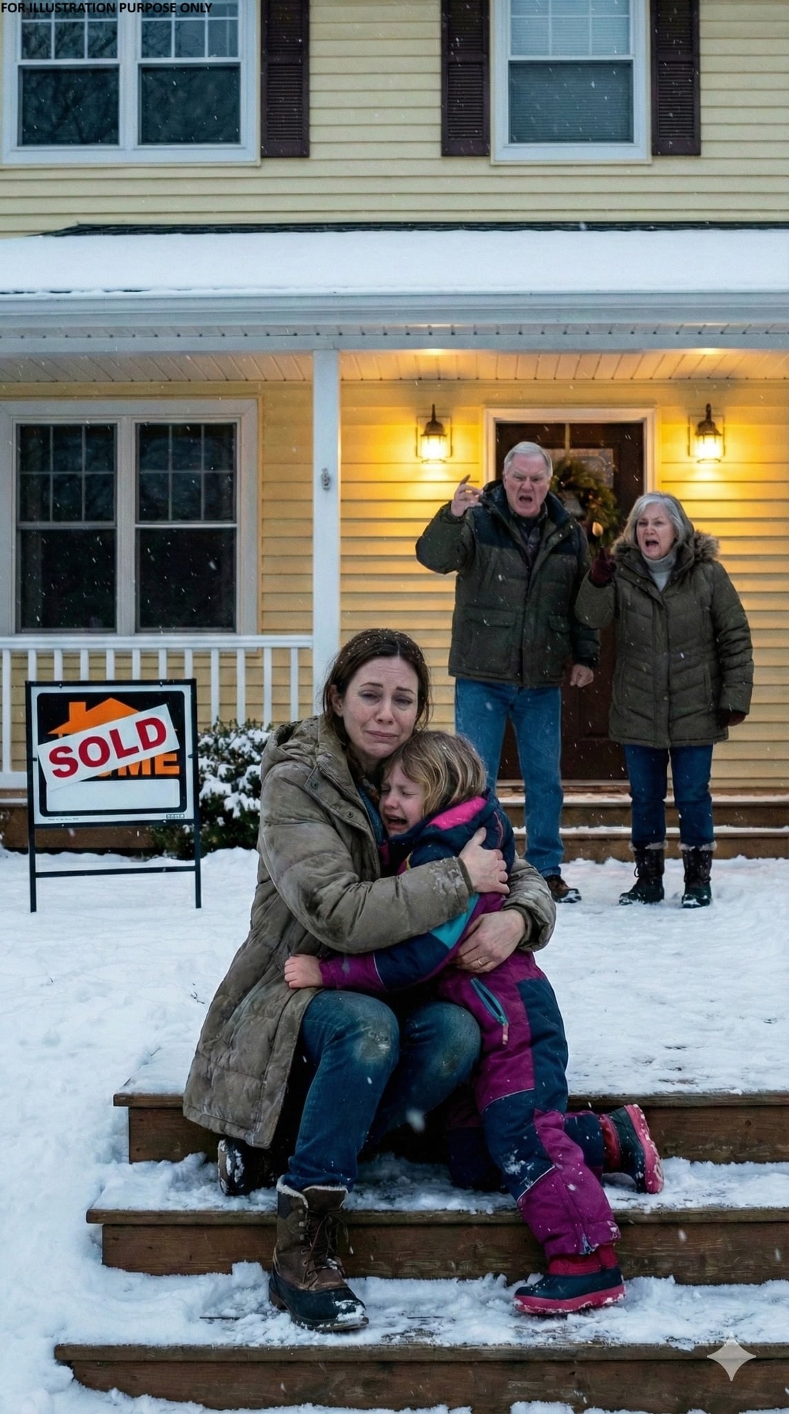 One afternoon I received a message from my neighbor Angela that simply said, “Check your camera.” Alarmed, I opened the security app and saw my five-year-old daughter Meline standing alone outside our house in the snow. A large SOLD sign had been placed in the yard, and my parents—who had been staying in the house—refused to let her inside. The footage showed my mother pushing her away from the gate and later my father opening the door only to slap her and shove her down the steps. My daughter had been outside for hours in the freezing weather until Angela finally ran across the street and brought her into safety. She was already showing signs of hypothermia.