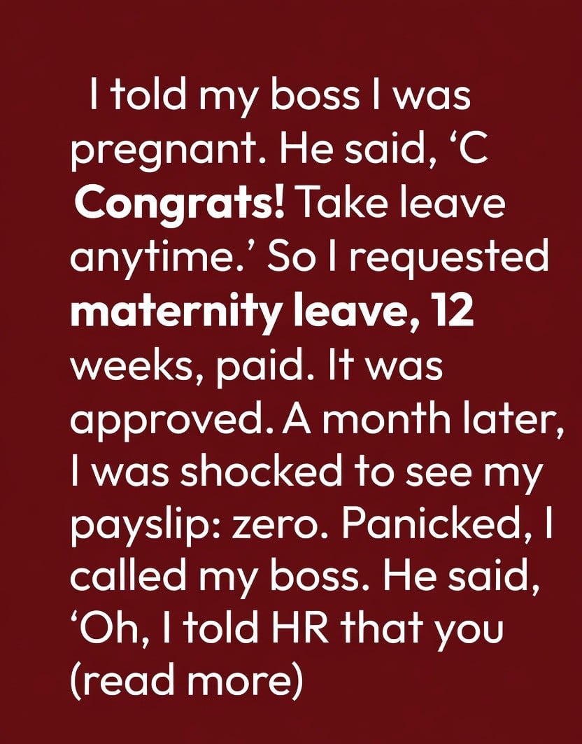 I requested 12 weeks of fully paid maternity leave, and my boss approved it, making me feel relieved and supported during such a life-changing moment. Everything seemed perfect, and I began preparing for the arrival of my baby with a sense of security.