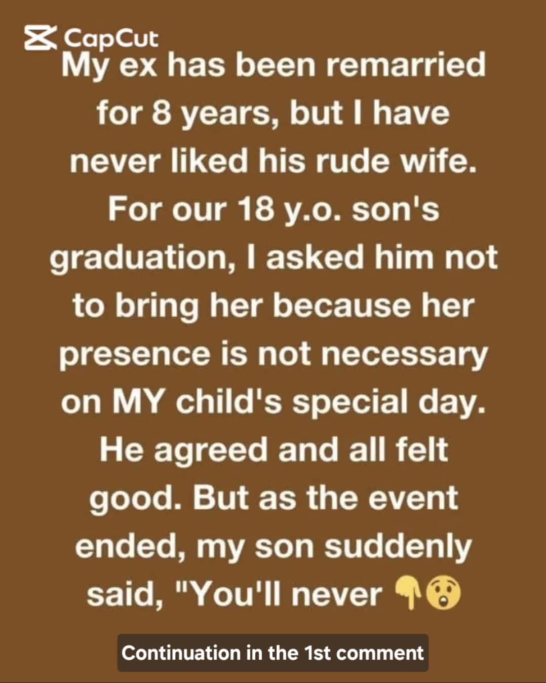 He agreed, and everything felt good. But when the event ended, my son and his dad suddenly turned their backs and headed to their car. Confused, I reminded them that I was hosting a small party at my place.My ex then said they were going to his house because his wife was throwing a big party to make up for her absence at the graduation.