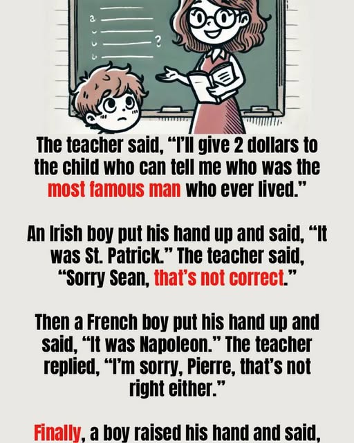 The teacher said, “I’ll give 2 dollars to the child who can tell me who was the most famous man who ever lived.”