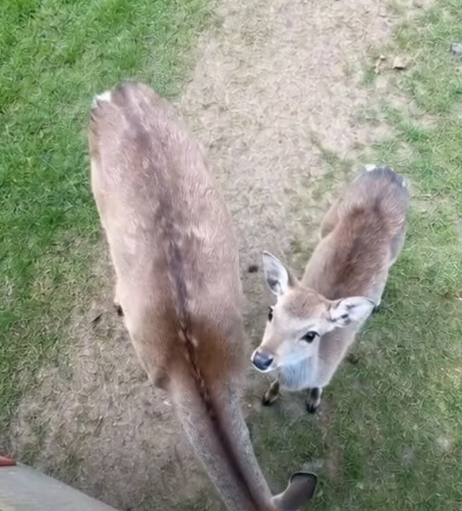 They appeared without warning, stepping out from the treeline while I tossed hay near the fence. Calm and unafraid, the larger deer stayed close, alert and steady. The smaller one stared at me with wide, curious eyes.