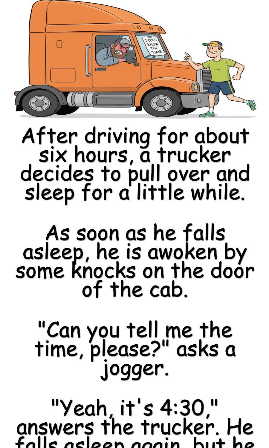 “Yeah, it’s 4:30,” answers the trucker. He falls asleep again, but he is awoken again by another jogger who wants to know the time.