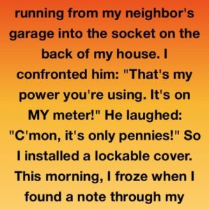 I discovered an extension lead running from my neighbor Ron’s garage into my house and, frustrated, installed a lockable cover. A note slid through my letterbox the…